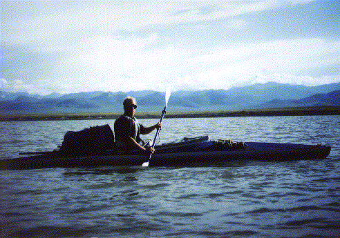 Our last camp with the rafts was where the river made a sharp turn to the northwest. Here we were going to change from rafts to kayaks and lose most of the people. Only 5 of us were going to continue on to the arctic ocean. We all went for a walk up the top of the mountain where we had a great view of the North Slope, the arctic ocean and demarcation bay (our destination). It was so cool to stand and look south towards the high mountains where we started and then turn and look north to where we where headed. What awesome country. We were just hanging out at the summit with a nice stiff breeze blowing when all of sudden it felt like we were getting hit with sleet. It was an army of mountain mosquitoes! We could not believe that they could fly in these windy conditions.